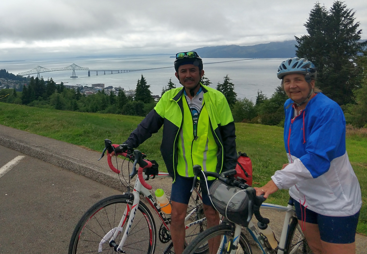 (Cassie) So, on June 24, 2020, we found ourselves packing our bikes in boxes, along with our gear and some food. We were fortunate that a friend of our daughter had a brother in Portland, OR, who was willing to pick us up from the airport and let us stay with them for the night. We needed to repack, reassemble our bikes, etc. and the next morning we were off! Because we wanted to follow in Peter and Lucas’ footsteps, we biked from Portland to Astoria on the coast for the official start of the TransAm trail. Who knew that Portland was so hilly? And that in between Portland and Astoria, we would need to cross the Oregon Coast Range? We took 2 days to do those 125 miles. Our Astoria Warmshowers host met us on the road and suggested a ride up a steep hill to the Astoria Column at the end of our hilly day to enjoy a wonderful view of the Columbia River and the surrounding area.